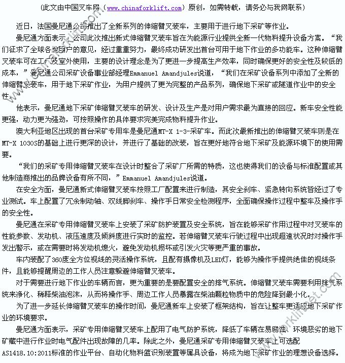 法国Manitou集团成立于1956年,是法国排名第一的叉车公司,在越野叉车领域一直处于世界领先地位。是法国巴黎的上市公司,主要致力于工业叉车领域、建筑领域、农业领域三大领域的发展。Manitou集团倡导全球化的营销理念,并一贯秉承:“让我们的客户、生产和合作者满意”的宗旨,Manitou集团现已在全球有23个附属公司,其中17个是销售公司,5个工业性子公司,9个生产配套件基地,600个分销商,足迹遍布120个国家。