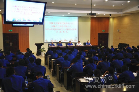 7月14日上午,安徽合力研发大楼一楼报告厅内齐聚着合力的一批新鲜血液,他们身着天蓝色的夏装,稚嫩的脸上洋溢着幸福的欢笑,展现着无尽的力量和自信;安徽合力2014年高校毕业生入司教育开班典礼在此隆重召开,安徽叉车集团总经理杨安国,安徽合力总工程师马庆丰应邀出席。人力资源部、政治处、公司办、大学生支部等部门相关负责人以及2014年合肥本部新入司全员,共90余人参加开班典礼。