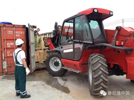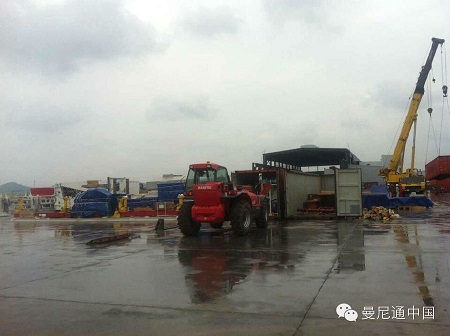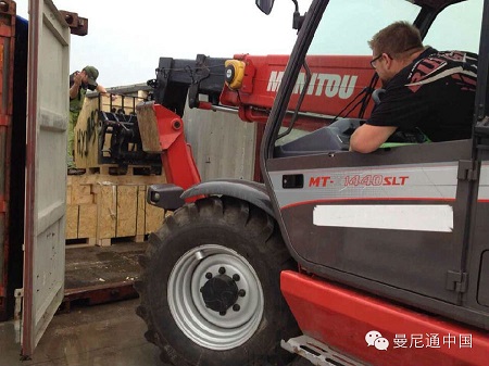 目前MT-X1440的工作是将进口的各种设备从集装箱中掏出来,并搬运至厂房内部。之后,曼尼通伸缩臂还将参与后续的厂房内的设备安装作业。