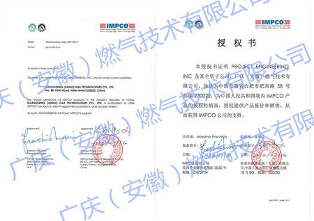 中国叉车网新闻中心讯:2014年6月美国IMPCO(英普科)高层亲临广庆(安徽)燃气技术有限公司,正式与广庆续签最新年度的中国大陆及台湾地区独家总经销协议,并签署书面授权证书明确广庆公司为IMPCO在中国地区官方授权经销商,再次获得IMPCO产品销售及售后支持并受到法律保护。
