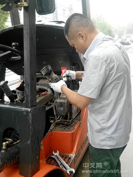 迪凯叉车服务人员冒雨为客户进行产品维护