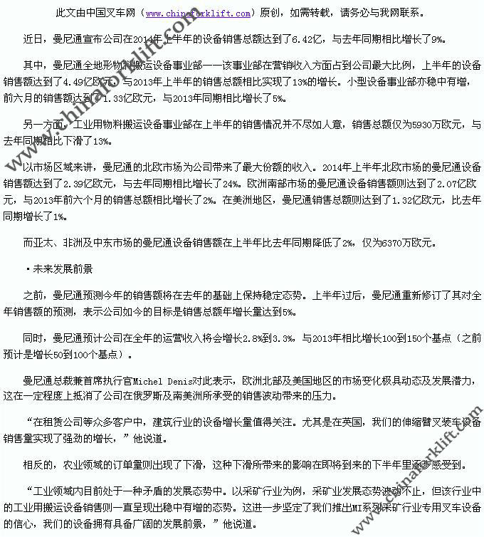 曼尼通(杭州)叉车有限公司于2003年6月9日在浙江省杭州市余杭区余杭经济开发区北沙西路20号注册成立 ,是曼尼通集团在中国大陆投资的第一家独资子公司,公司注册资本540万美元,投资总额900万美元。主要生产经营1.5-3.5T内燃平衡叉车,产品销往欧洲、北美、亚洲、非洲等120个多个国家,曼尼通有着一支年轻化和专业性的团队,来自全国各地的精英汇聚一堂,朝气蓬勃,专业技术人员占员工总数的10%以上,曼尼通有着严谨和优秀的管理模式和管理理念,坚持用企业文化提升企业核心竞争力,扩大社会影响力;曼尼通有着超卓的设备,现代化的工厂规模,曼尼通以“引申我们的产品范围,扩大市场;顾客的满意度是我们至高的境界;激励我们的团队;持续有利发展”为经营理念,曼尼通人本着开拓创新的理念和敢为天下先的思想,必将拥有广阔的天空,它的发展势不可挡。