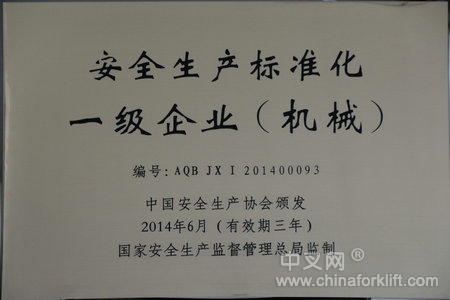 近日,国家安监总局2014年第16号公告公布:安徽叉车集团有限责任公司暨安徽合力股份有限公司,经国家安全生产监督管理总局审核批准为"机械制造安全生产标准化一级企业",并授牌。此认定有效期三年,自2014年6月至2017年5月。