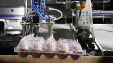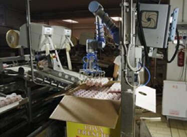 在意大利的Cascina Italia工厂,一个在包装流水线上工作的协作机器人每小时可以处理15,000个鸡蛋。这种机器人配备了气动夹具,可以完成10枚装蛋托的装箱操作。由于每个蛋箱装有9层10枚装蛋托,因此这项工作需要非常精确的操作和小心的放置。