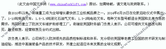 关于奇瑞迪凯重工:奇瑞迪凯重科安徽工业车辆有限公司是奇瑞重工的重要板块之一,基地总投资6亿元,占地面积近300亩,二期...