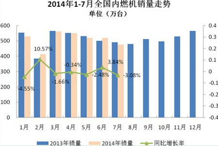 根据中国内燃机工业协会《全国内燃机销售月报》显示,2014年7月全国内燃机完成销量 475.35万台,同比下降3.08%,1-7月累计完成销量3563.17万台,同比下降 0.65%;7月完成14854万千瓦,同比增加2.44%,1-7月累计完成118978万千瓦,同比增长10.50%。柴油机市场略有回暖,汽油机市场小幅下调,总体继续表现稳中略有下降态势。