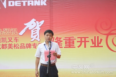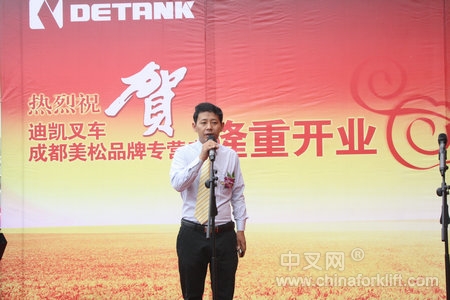成都美松叉车有限公司总经理马玉炎向在场的嘉宾致辞,他说多年来的合作经验表明,和迪凯合作选择无疑是非常正确的选择。而今,工程机械巨鳄中联重科的介入,使得新店如虎添翼,相信美松和迪凯的合作会越来越好,前途会越来越光明。
