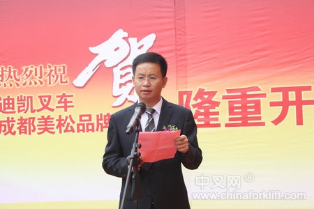庆典仪式由奇瑞迪凯重科安徽工业车辆有限公司品牌总监谭轶主持。迪凯叉车公司总经理江明发表热情洋溢的致辞,他在致辞中说,今天和来自全国各地的朋友们一道共同参加庆典,和成都美松公司全体同仁共同见证这一里程碑的时刻,分享喜悦和快乐。他回顾了最近几年和成都美松公司合作的历程,双方以诚信为本客户为基,紧紧围绕客户资源开发,提升客户价值,业务量节节攀升。很显然,美松公司已经成为迪凯叉车在全国所有代理商中成功合作的典范。他对新店的开业作出四点期许和祝愿:一、期待成都品牌店成为进一步提升客户的价值之店。二、期望成为双方成功合作典范之店。三、期望成为双方合作的友谊之店。四、祝愿成都品牌店成为百年老店。最后,他还提议现场的嘉宾,当把今天的美好时刻,即刻用微信分享给各自的圈子并写上:祝迪凯叉车成都美松品牌形象店,开业大吉、生意兴隆!