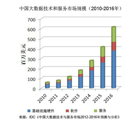 目前,中国大数据技术和服务市场规模依然不高;但同样会在未来24月快速增长,产值翻倍。