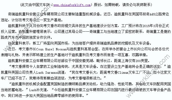 奇瑞迪凯重科安徽工业车辆有限公司是奇瑞重工的重要板块之一,基地总投资6亿元,占地面积近300亩,二期工程全部投产后将具备年产3万台的工业车辆生产能力。