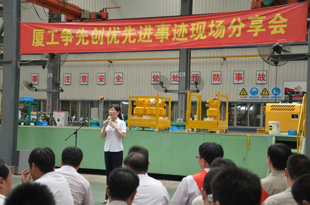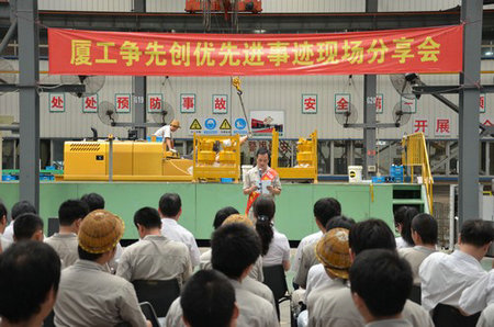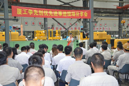 8月28日,厦工“争先创优”第二季度现场经验分享会在挖掘机事业部装配车间举行,厦工领导、各基层党支部书记、挖掘机事业部经理人和一线员工共计百余人参加。会上,红旗单位、明星员工、质量优秀奖代表分别进行了绘声绘色的事迹分享,不时赢得阵阵热烈的掌声。