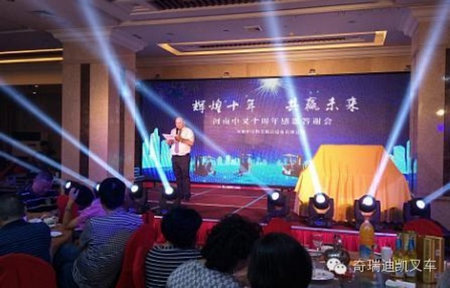 2014年9月5日,迪凯叉车代理商河南中叉物流搬运设备有限公司开业十周年店庆晚会在郑州市管城回族区瑞贝卡酒店隆重举行,来自河南各地的业内同仁、叉车用户与该店全体员工共同见证了晚会的举行,现场气氛十分热烈。