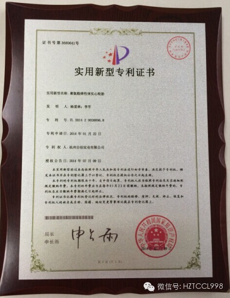 经过不断的研究与努力,杭州台创实业有限公司终于迎来了聚氨酯弹性体实心轮胎专利证书!以我们的努力为您更好的服务,以我们的专业为您提供更好的产品,以质求存,杭州台创,值得信赖!