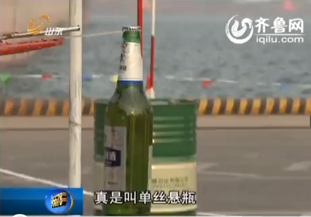 最后的压轴大戏,工人们现场把啤酒吊在尼龙丝上,白白的细丝已经拉得紧,同时,工人们还要保证第二个瓶子不会掉落。