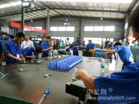 在接下来选拔出的20名选手参加实操比赛,实操比赛分电动叉车的维修与钳工实操比赛两项。目前叉车行业的维修技术人员特别是擅长电动叉车的维修人员非常短缺,广东合力特别重视这方面的培训。在本次比赛中,在对电动平衡重式叉车的维修中,由安徽合力技术部的监考人员人为设置了三处故障,而其中最快的参赛选手仅用不到20分钟全面排除故障,并在答题卡上写出故障、分析方式及解决故障的办法,虽有的参赛选手所需时间比较长,但都能在规定的时间内排除故障。钳工是一个技术性很强的专业,凡是采用机械加工方法不太适宜或是难以进行机械加工的场合,通常由钳工来完成。在钳工实操比赛中,主要用到锯、挫。给定一块铝材,通过划线来确定点、线、面的位置,根据精度要求、表面质量的好坏和加工材料的性质,选择不同的锉刀,把一块铝材加工成六菱形;另再把一块5CM正方形的钢材用锯子锯开一分为二,在锯削时,如何让锯条不被锯缝咬住,减少锯条与锯缝的摩擦的阻力。选手们都拿出了自己的看家本领,顺利的完成了比赛。