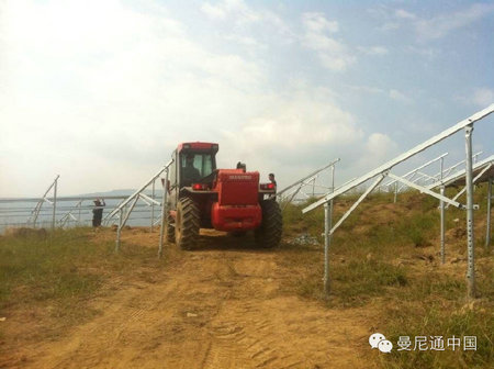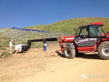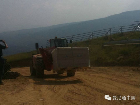由于该地是山区,光伏项目又建在山顶,项目的建设在大量光伏太阳能板的搬运上就遇到了瓶颈。普通叉车在山地不可能作业,吊车又不具备搬运能力。这时候客户接触到了曼尼通伸缩臂叉装车。