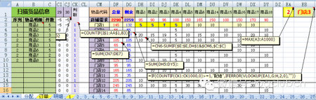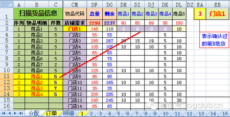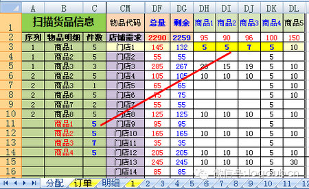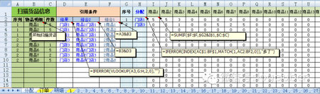 EXCEL表格中函数公式思路:1,如何确定每批扫描的货品明细,即批量如何界定?2,如何计算此批货品应当分配给哪个门店?3,如何显示每批货品对应的门店?4,如何确认已经分配的货品给到了相应的门店,不至于重复分配?5,如何计算各门店各商品已经分配的数量,从而计算剩余数量?6,当货品放入数量过多,各个门店均不需要时,如何显示“多配”?7,当放入错误的货品(不在订单范围内)时,系统如何报警提示“配错”。