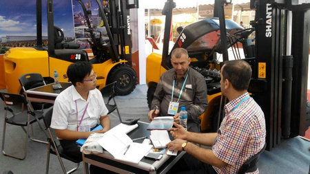 山推叉车携2014年新机型亮相展会现场。特别是新款全交流1.5T电车,3T S型高配柴油车等,本次参展车辆全部涂装为出口叉车量身定做的山推黄与哑光黑搭配流行色调---彰显出新机型的厚重且质感。亮相广交会第一天,就吸引了大量客户驻足观看。