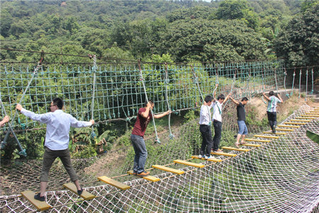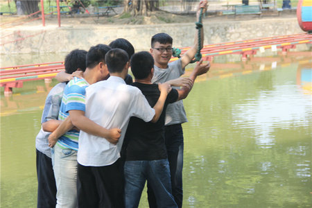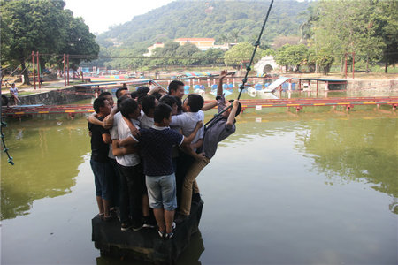 其中,最令大家回味的是下午进行的无组别对抗的水上拓展项目之一——孤岛求存。所有销售人员借助空中的长绳一个一个从岸边荡到水面一个仅为1平米的平台上,他们必须打破队员之间、男女之间、部门之间的隔阂,互相紧搂依偎才能站稳在小平台上,而且还得接住和稳住荡过来的人员,最后待平台站满人后再利用长绳荡回岸边。起初有些队员的腿甚至是颤抖的,然后下面一直传来队友们激烈的鼓励,最后还是成功飞跃到平台上。整个项目过程中,大家经历了恐慌——勇敢——胜利的过程。从此可看出,人的潜能是需要挖掘的,要创造条件,寻找机会。拓展训练的项目对人的体能的要求并不高,更多的是对人心理的挑战。通过心灵和精神上一个个新的超越,队员们从新认识自己、认识生命。