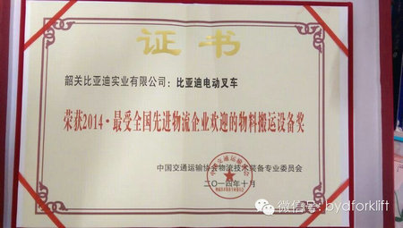 10月16日,由中国交通运输协会主办的“2014年度先进物流企业表彰大会暨全国物流发展大会”在北京顺利召开,本次会议以“创新•转型•智慧•绿色”为主题,旨在激发物流及物流装备企业的动力与活力,推动我国的绿色物流产业的发展,2014最受全国先进物流企业欢迎的技术装备奖颁奖盛典在16日晚上举行,经过组委会和专家的考评,比亚迪叉车被授予“2014最受全国物流企业欢迎的物流搬运设备奖”。