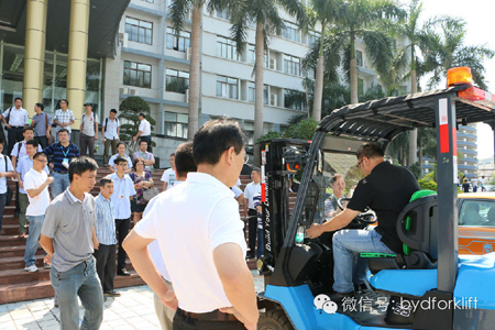 中港协100余人于早上九点多到达比亚迪六角大楼,比亚迪叉车销售总经理王惠明热情的接待了来访贵宾。双方领导在进行简单的交流后,开始分批次参观比亚迪展厅、比亚迪汽车总装车间以及试乘试驾比亚迪新能源汽车及新能源叉车。在比亚迪展厅,王总详细介绍比亚迪集团的发展状况,并重点介绍了比亚迪新能源产业及比亚迪叉车和汽车的核心技术及特点,以及其在油电差价方面的强大优势。特别是比亚迪在港口行业提出的绿色解决方案,领导们对比亚迪所掌握的新能源技术赞叹不已。来访贵宾参观比亚迪总装车间时,近距离接触了比亚迪汽车生产线,感受比亚迪汽车的最新技术和工艺,纷纷对比亚迪的发展战略、制造工艺、品质管控给予了高度评价。最后,中港协的领导都纷纷在广场进行试乘试驾比亚迪新能源汽车及新能源叉车,在了解到腾势是比亚迪与奔驰合作推出的产品后,纷纷伸出大拇指,随后他们在亲自试驾感受腾势汽车、比亚迪秦和比亚迪叉车后,对比亚迪产品的操控性及稳定性表示赞许,并感叹道:“有这么好的技术,这么好的服务,这么好的政策,你们比亚迪不发展起来都难啊。”