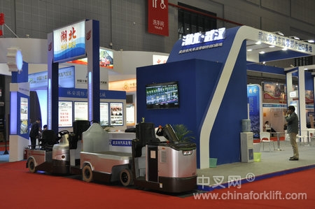 在3号馆的湖北展区,武汉圣翌电动工业车辆有限公司就位于此。在现场展示3款产品:三支点4吨电瓶牵引车、站式3吨平板牵引车和站式3吨牵引车。作为唯一参展的工业车辆企业,展品吸引不少观众的关注。