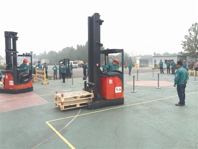 据了解,此次叉车比赛的项目为载货通行和货物堆垛,参赛选手要将放有4罐可乐的木托拍正向行驶通过2.2米宽的通道至终点,然后再带上一个相同的木托拍,绕过S形障碍,把货物平稳放下,回到原车位鸣笛示意比赛完成。记者在现场看到,参赛选手们技艺纯熟,比赛结果一次次被刷新,不到一个小时就完成了全部比赛。