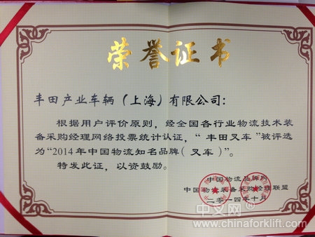 10月28日,由中国物流品牌网,华夏物联网研究中心,中国物流装备采购经理联盟主办,通过众多制造业物流总监、商贸业物流经理和第三方物流企业负责人在中国物流品牌网公平、公正、公开性的在线投票,丰田叉车获选“2014年中国物流知名品牌”入围企业榜单。