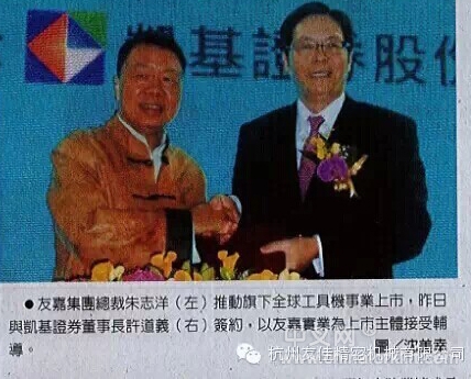 喊出2020年工具机事业力拼千亿营收规模的友嘉集团,将启动国内工具机业首见的超级上市案,友嘉总裁朱志洋于11月6日与凯基证券董事长许道义签订辅导契约,预计2016年下半年登陆兴柜,2017年挂牌上市,估计规模及市值将超过现有上市柜工具机厂总和。