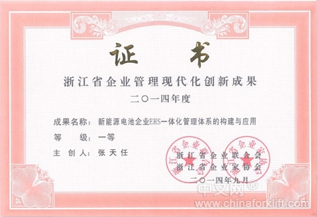 日前,从浙江省企业联合会、浙江省企业家协会传来喜讯,天能集团由省劳模张天任主要创造,陈敏如、周建中、李百英、蒋玉良、李明钧、张旭东等人参与创造的“新能源电池企业EHS一体化管理体系的构建与应用”成果,荣获2014年浙江省企业管理现代化创新成果一等奖。