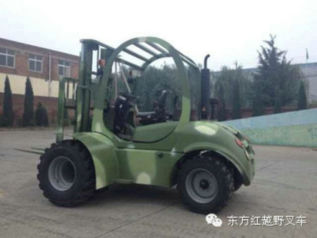 ,日前装备某军方单位。按照采购方的要求该款叉车涂上了迷彩色、配装了双前轮、沙漠空气滤清器、高位空气进气等装置,更加适合全地形作业和野外工况。
