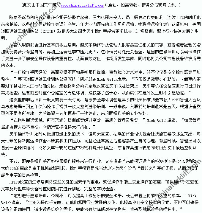 RTITB是英国及爱尔兰地区最大的工作场所物料搬运操作培训认证机构,同时也是工作场所运输安全认证机构联合会的创始成员之一。RTITB的课程类型丰富,其中包括进修培训,旨在督促物料搬运行业内各大公司能够实现可持续的监管及评估,确保操作手始终保有高度的安全意识,并符合业内最高的职业健康、安全标准。