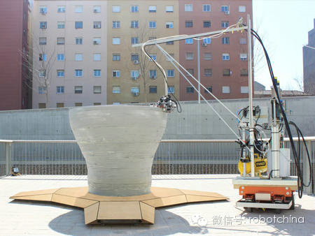 和构建传统建筑物一样,建筑流程需要从一个坚实的地基开始。“地基机器人”是一台装配了传感器的设备,可以沿着地上标记的线进行工作。建筑师可以在建筑台上面先勾勒出建筑的轮廓,然后地基机器人就开始进行连续螺旋式循环,浇筑好前20层建筑材料。基本上,我们可以把这个地基机器人看作是一个从底层开始堆积建筑材料的“建筑师”。