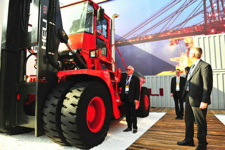 本次展会新推出的以LNG集装箱空箱堆高机为代表的新型燃料动力产品,系合力致力于环境友好、节能环保,通过国家级企业技术中心集成研发并成熟应用,经过专门设计改进而推出的最新款产品。与柴油车相比,该款产品排放的颗粒物为零、一氧化碳排放少50%,碳氢化合物和氮氧化合物排放少80%,各类污染物减少40%左右,从根本上改善了作业中对环境造成的污染,向中外客商全方位展示了中国工业车辆行业领先的研发创新能力和强大的制造水平。