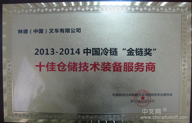 同期,由中国物流与采购联合会冷链物流专业委员会组织的“2013-2014(第三届)中国冷链产业‘金链奖’评选”颁奖盛典顺利举办。经过评审委员会的认真审核,林德叉车产品多项核心指标处于行业的领先地位,特别是在冷链行业中拥有丰富的成功案例。因此最终被审定获得“中国冷链十佳仓储装备技术服务商”奖项。