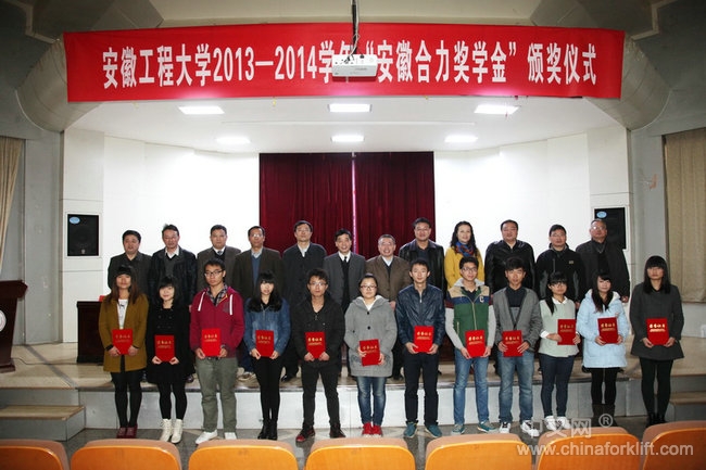 近日,2013—2014学年“安徽合力奖学金”颁奖仪式在安徽工程大学学术报告厅举行。安徽叉车集团总经理杨安国、安徽工程大学校校长刘宁、副校长叶常林及双方相关负责人、全体获奖学生和部分学生代表参加了颁奖仪式。颁奖仪式由叶常林副校长主持。