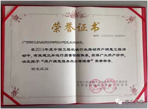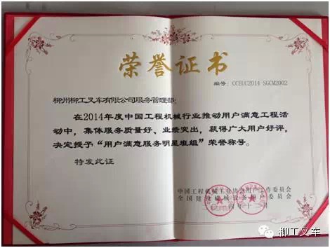 2014年,柳州柳工叉车有限公司(简称柳工叉车)服务管理部积极响应中国工程机械工业协会用户工作委员会举办的创建“用户满意服务明星、用户满意服务明星班组、用户满意服务杰出管理者”活动,通过服务团队的努力,于2014年12月20日在湖北武汉举办的中国工程机械工业协会用户工作委员会年会上,荣获2014年叉车”用户满意服务明星班组”荣誉称号,柳工机械股份有限公司副总裁王太平先生荣获2014年”用户满意杰出管理者”称号.