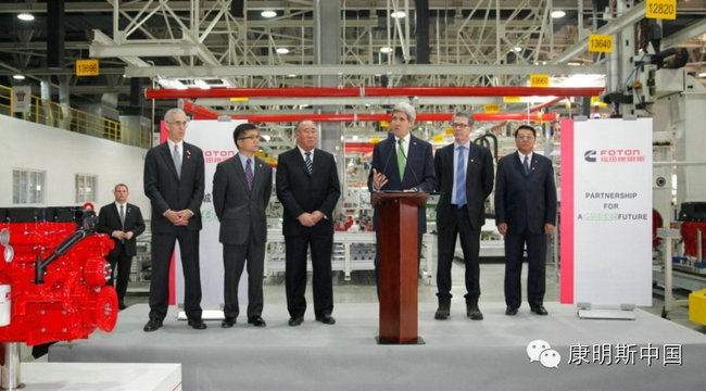 2014年2月15日,美国国务卿约翰•克里访问了北京福田康明斯发动机有限公司的重型发动机工厂,参观了康明斯ISG发动机工厂生产线,并就美中两国加强应对气候变化的合作向在场200多名观众发表演说。克里表示北京福田康明斯发动机有限公司的成立,先进的康明斯ISG重型发动机平台及其领先的制造水平,不但为中美发动机业务发展描绘出一副蓝图,更代表了中美间的互利合作。克里高度评价了康明斯在中国市场以及清洁动力方面所取得的成就,并鼓励大家通过不断创新,精诚合作,开创更加环保、清洁的未来。