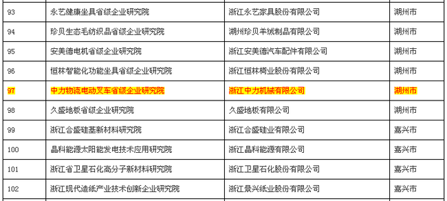 12月26日,浙江省科学技术厅公示了2014年省级企业研究院建设名单。中力是此次名单中唯一一家电动叉车生产企业,中力电动叉车研发中心也升级为中力物流电动叉车升级企业研究院。