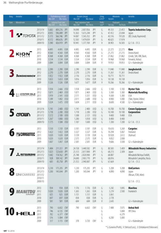 德国DHF物流杂志近日发布2013/2014年度(2013年7月1日至2014年6月30日)全球工业车辆排行榜, 被列入排名的是在报告年度(2013/2014)中至少10亿欧元的营业额的制造商,此营业额全部为机动车,不包括手动托盘搬运车,也不包换部分叉车制造商在物流系统业务方面的销售额,在此排名中的“G”为“赢利”、“V”为“亏损” 、“U”为“未知”。
