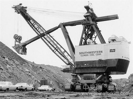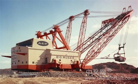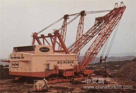 Bucyrus-Erie 4250W(Big Muskie)BIG MUSKIE官方编号为BE-4250W,是迄今最大的步进式拉铲,1967年B-E开始为美国的一个露天煤矿建造它,直至1969年5月建成并投入使用,当时的制造费用为2500万美元,专门用于土石剥离。它有22层楼高,用13800V高压电驱动,仅空铲斗的重量就有209吨;1991年Big Muskie因矿区采空而停止运行,1999年爆破拆解,仅铲斗留存下来。