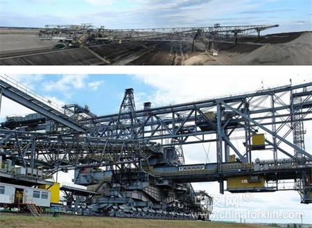 6 最大自行式工程机械——502米,13600吨TAKRAF F60F60表土输送桥(或称排土桥),是至今为止在地球陆地上出现过的体型最大的自行式设备,是原先东德TAKRAF的杰作。它的作用是将挖掘机开采的物料直接送到剥离物料堆。长度为502米,宽240米,高80米,跨度270米,F60有720个车轮并在轨道上移动,其工作重量为13600t,和两台ES 3750 挖掘机一同工作,总功率达到27000kW(36000马力)