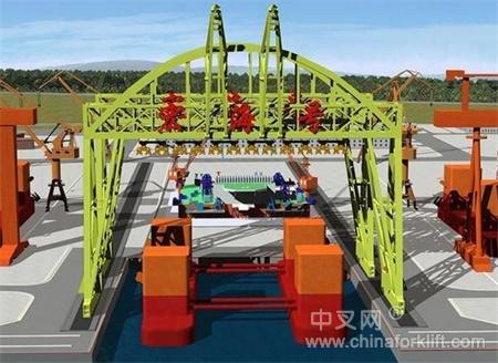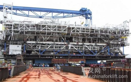 9 最大的龙门吊——22000吨 宏海号(建造中)“宏海”号22000吨起重机,主要用于海上石油钻井平台陆地整体制造、提升、运输和下水。以往海上油气钻井平台的安装,需要把平台的相关设备“化整为零”,然后在海上慢慢进行拼装。而今,该起重机将使“海上平台陆地整体造” 得以实现。海上油气钻井平台可以直接在陆地拼装好,然后借助22000吨起重能力的“大家伙”,把拼装好的海洋油气钻井平台从陆地上的专用拼装胎位上提起来,直接放到海上去。设备总体高度150米,提升高度最高为65米,相当于把重量为500节高铁车厢或20层楼高的超重、超大型物件提升起来并行走。主体采用桁架式结构、拱形外观、多吊点双吊梁承载,跨度(124.3)米,宏海号总重14800吨,相当于两个埃菲尔铁塔的重量。