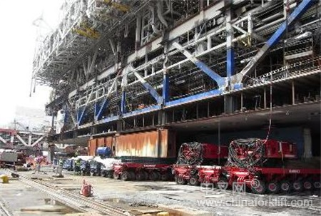 8 最大汽车载重记录——15000吨540轴SPMT2009年,挪威斯图尔,在这里,生产和装备世界上最大的石油平台。这次的任务是把一个用作废水处理业务的油分离装置从生产地运往附近的浮动平台,这种活还得靠SPMT这种特殊运输工具来完成。整个装置由三部分组成,它那超大的尺寸让人印象深刻,尤其是它的中间部分就有12750吨重,整体重量高达15000吨,相当于83架747客机的总重。比利时吊装运输巨头SARENS承接了这个大型项目。运输物靠9400马力驱动,总共2160个轮子。