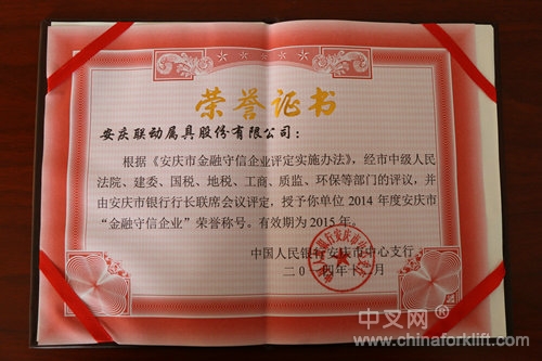 经过历时数月的考评,日前,中国人民银行安庆市中心支行授予安徽合力安庆联动属具股份有限公司2014年度“金融守信企业”荣誉称号。