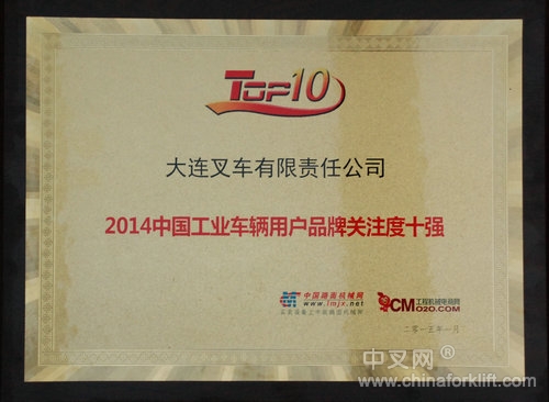 近日,在由中国路面机械网及工程机械电商网联合主办的“2014中国工程机械用户品牌关注度排行榜”评选活动中,大连叉车凭借出众的产品质量和服务带来的庞大的用户影响力脱颖而出,一举斩获“2014中国工业车辆用户品牌关注度十强”荣誉称号。