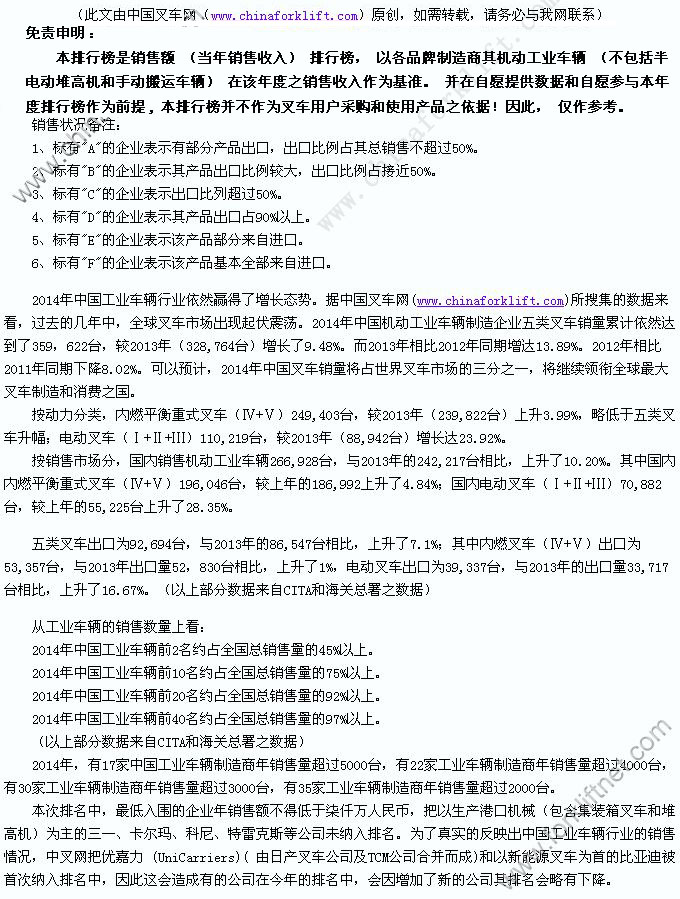 中叉网:2014年中国前40名叉车制造商排行榜