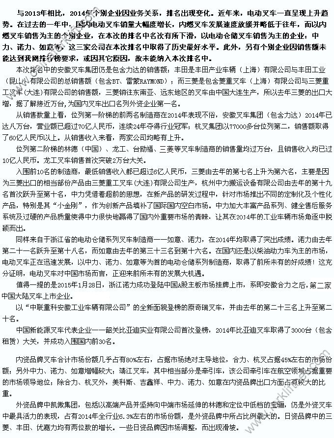 中叉网:2014年中国前40名叉车制造商排行榜