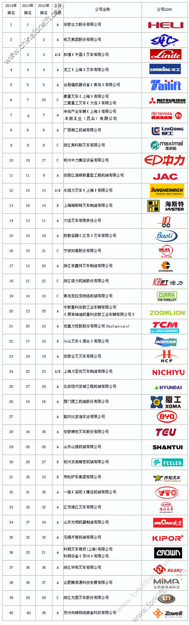 中叉网:2014年中国前40名叉车制造商排行榜