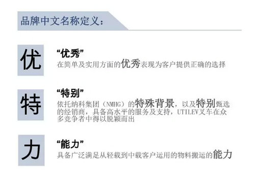 UTILEVTM,是美国纳科物料搬运设备集团旗下的第三品牌,这个名称取自Utility,意为实用的叉车。在2014年它拥有了正式的中文名“优特力”,并开始在中国地区得到广泛使用,如车体标签、产品样本等。这为提高中国客户对UTILEV品牌的辨识度提供了便利。
